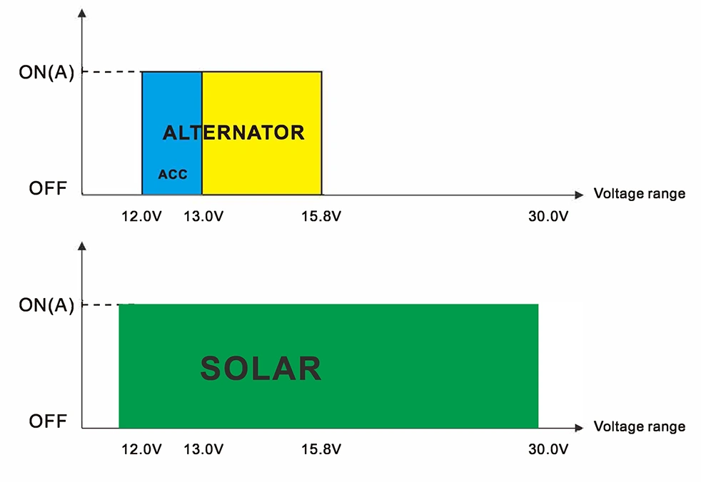 ● Universeller Wechselstromeingang 12,0 V–30,0 V, 0,2 V für Solar/1 2,0 V–15,0 V, 0,2 V für Auto